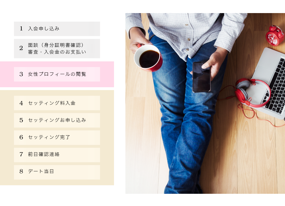 男性会員様のご入会からデートまでの流れ・使い方をご紹介致します。